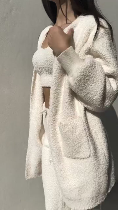 Soft as a cloud, warm as your coziest night in. This fuzzy lounge set is knit from plush, touch-me yarn that feels like a hug the moment you slip it on. The cropped tank, drawstring shorts, and flowing cardigan were made for layering, lounging, and living easy when the air turns crisp.