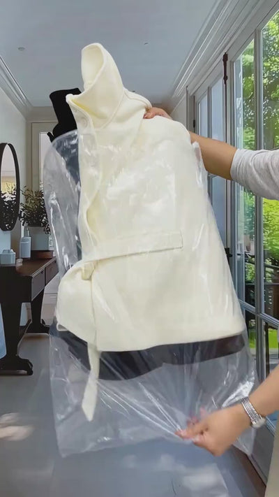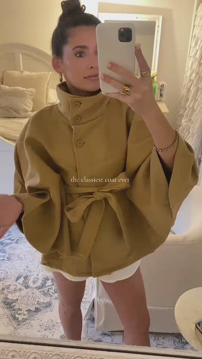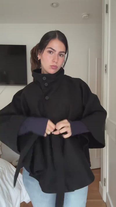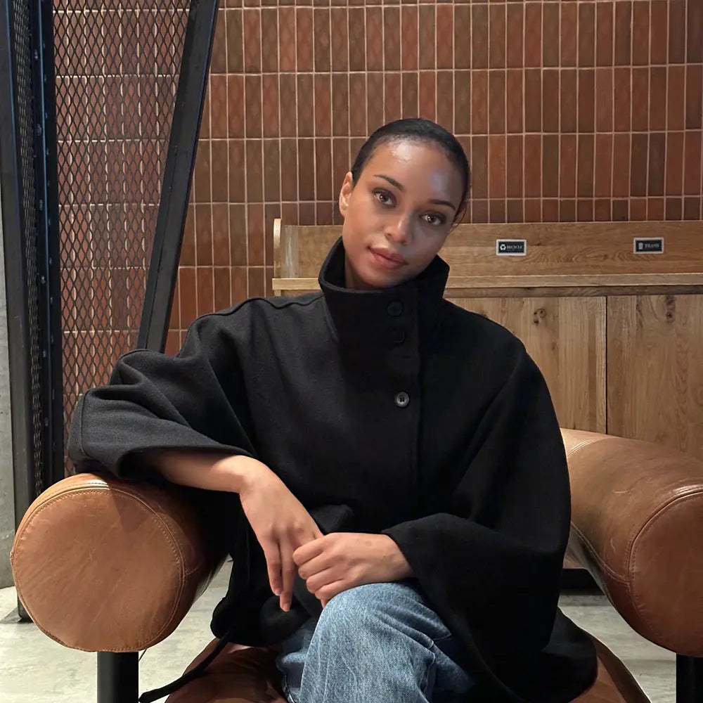 A sculpted cape coat designed to elevate every layer. The high funnel neck, fluid cape sleeves, and waist-cinching tie create a refined, architectural silhouette. Tailored with a clean drape and a crisp A-line cut, it slips effortlessly over knits and dresses while keeping proportions sharp and modern.